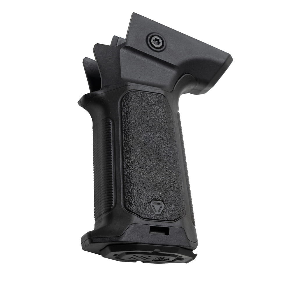 Chwyt wyposażony jest w wygodny beavertail oraz bezpieczny schowek wewnętrzny, który pasuje do opcjonalnego uchwytu Strike Pistol Grip Plug Tool Holder SI-AR-GPT, umożliwiającego przechowywanie drobnych akcesoriów, takich jak narzędzia czy baterie CR2032.