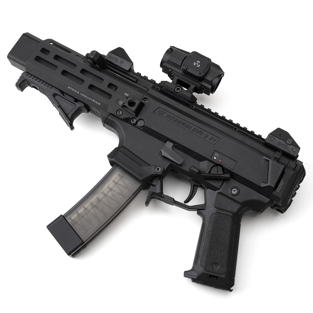Ergonomiczny chwyt pistoletowy do pistoletu maszynowego CZ Scorpion charakteryzuje się gumowaną teksturą i kątem nachylenia 15°, co znacząco poprawia kontrolę nad bronią oraz komfort użytkowania w porównaniu z fabrycznym chwytem CZ.