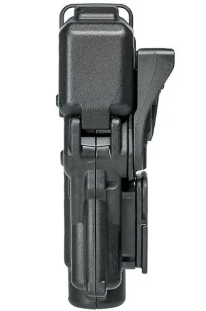 Aktywna ochrona: Blokada obejmuje zarówno okno wyrzutowe łusek, jak i kaptur zabezpieczający tył zamka (hood), co uniemożliwia przypadkowe wypadnięcie lub wyrwanie broni z kabury.