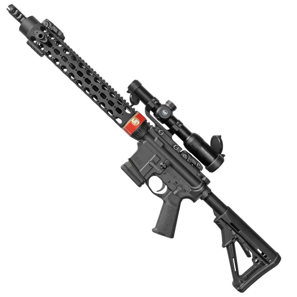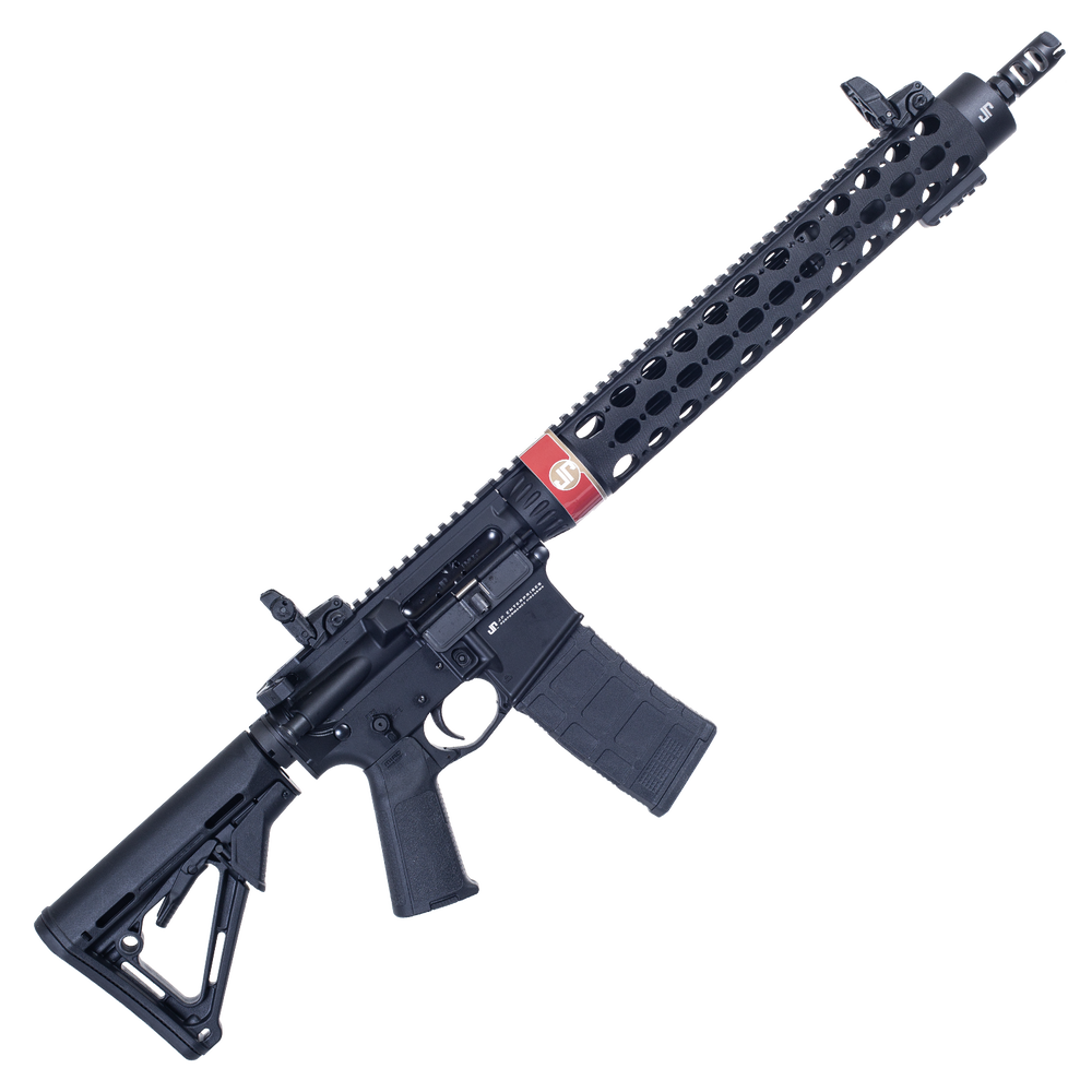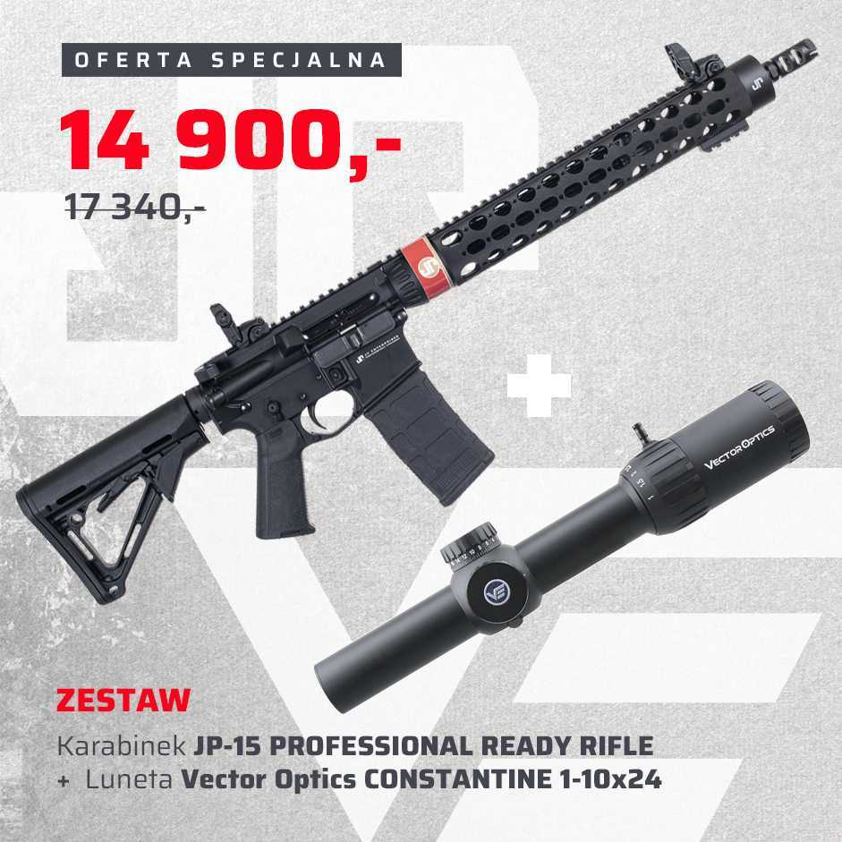 JP 15 PRO jest karabinem służbowym zbudowanym na bazie doświadczeń wyniesionych ze strzelectwa dynamicznego. Jednostopniowy mechanizm spustu pracuje doskonale z niedużym oporem 1,6-1,8 kg. Bezpiecznik manualny został zdublowany na prawą stronę, a chwyt pistoletowy Magpul można dostosować do dłoni i własnych upodobań wymiennymi wkładkami. Na typowej dla JP prostej rurze łoża (15,5" JP MK III Rapid Configuration XL) mamy długą szynę picatinny i bardzo dobre, składane przyrządy celownicze MBUS. Standardowa jest również magpulowska, sześciopozycyjna kolba. W odróżnieniu od broni do sportu, na lufie zamontowano niewielkie urządzenie wylotowe JP Tactical Compensator.