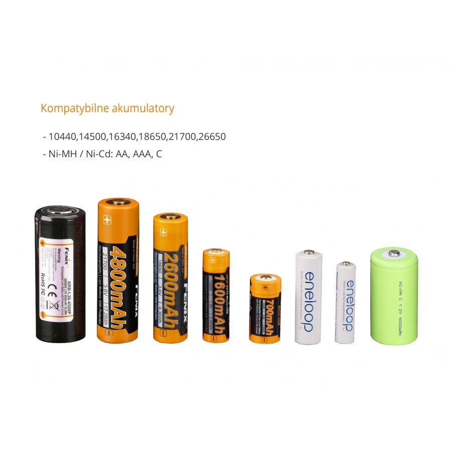 - Li-ion: 10440, 14500, 16340, 18650, 21700, 26650
