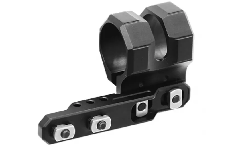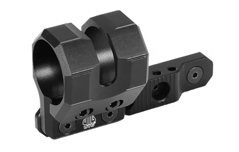 Leapers Offset Flashlight Ring to niskoprofilowy, kątowy montaż do latarki, zaprojektowany do systemu M-LOK. Umożliwia przymocowanie latarki o średnicy tubusu od 20 do 27 mm. Wykonano go z lekkiego i wytrzymałego aluminium, które pokryto czarną, matową anodyzacją. Dzięki ustawieniu latarki pod kątem 45°, montaż pozwala na utrzymanie zwartego profilu broni, co jest szczególnie przydatne przy nowoczesnych technikach strzeleckich (np. chwyt C-clamp) oraz użyciu chwytów wertykalnych lub kątowych. Baza montażowa oferuje sześć pozycji do zamocowania oświetlenia. Pierścień jest domyślnie dostosowany do latarek 27 mm, ale dołączone polimerowe wkładki pozwalają na montaż latarek o średnicy 25,4 mm oraz 20 mm.