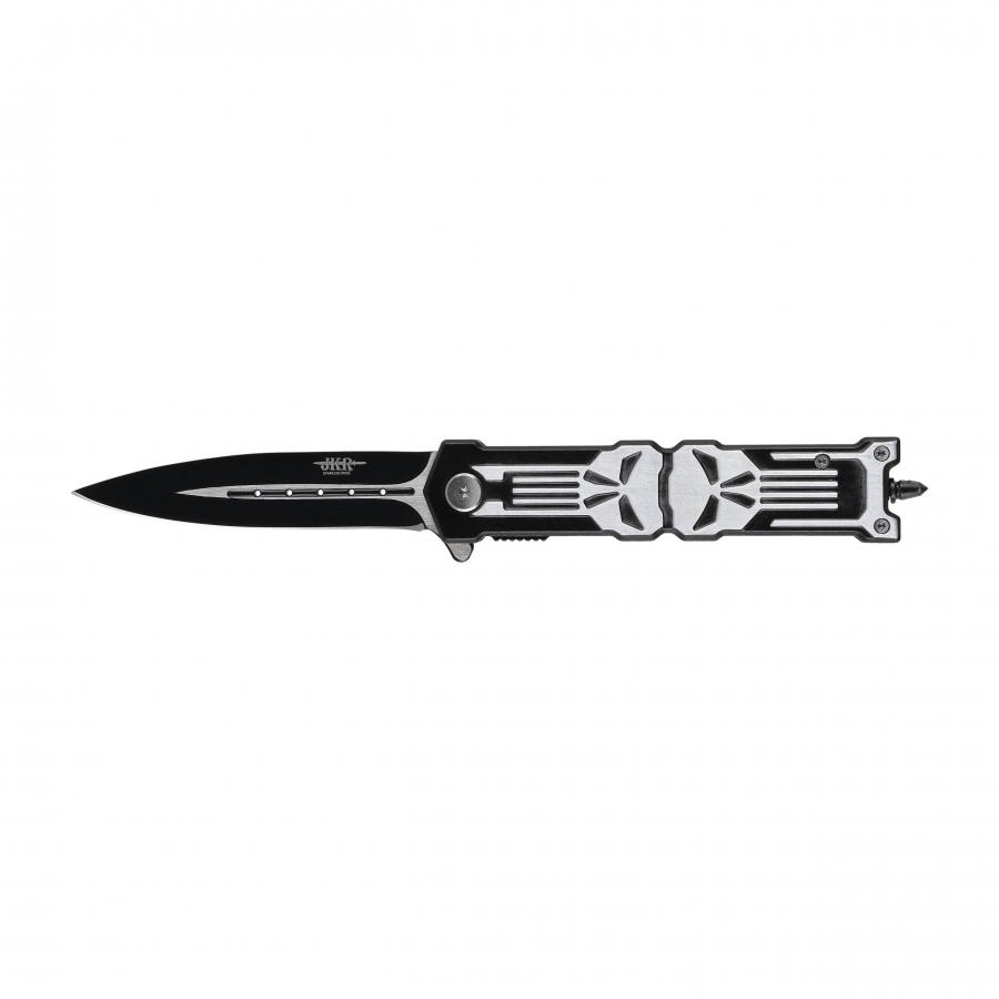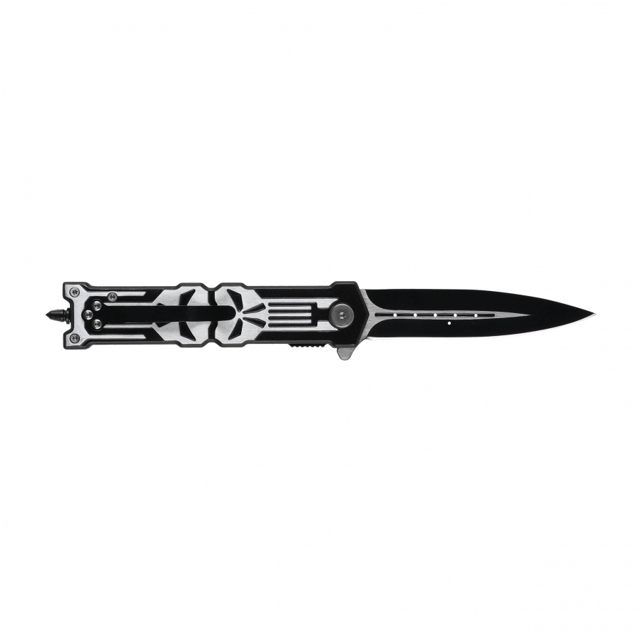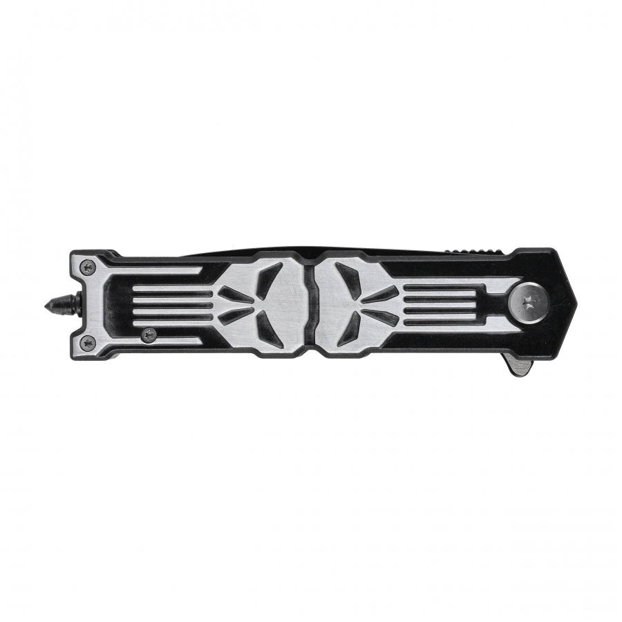 Rękojeść wykonana z aluminium posiada charakterystyczny motyw czaszki, który: