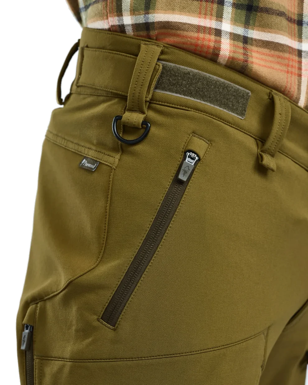 Spodnie myśliwskie Pinewood posiadają elastyczny pas z podwyższonym tyłem, który stabilizuje spodnie podczas aktywności. Regulowane nogawki na rzep umożliwiają dopasowanie do różnego rodzaju obuwia.