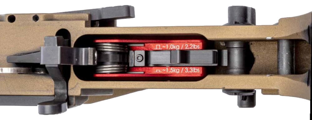 - Ciężar spustu można regulować w zakresie od 1000g do 1500g za pomocą predefiniowanych zaczepów. Nie wymaga regulacji. Ustawiony ciężar spustu można odczytać na obudowie.
