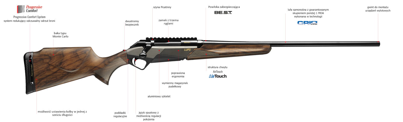 Konstrukcja pozwala na dopasowanie broni do preferencji użytkownika. Możliwość regulacji długości kolby, baka oraz stopka amortyzująca odrzut zapewniają maksymalny komfort i kontrolę, nawet podczas wielogodzinnego polowania. -