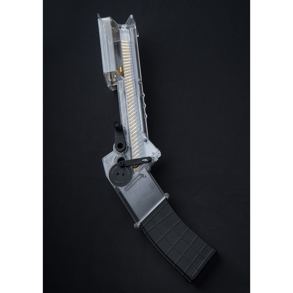 Za pomocą korbki, można załadować magazynek w zaledwie kilka sekund. Mechanizm jest prosty w obsłudze, a dzięki wskazówkom w postaci strzałek, kierunek kręcenia korbką jest jasny. Użycie wcięć pod palce drugiej dłoni zapewnia pewny chwyt, a czterostopniowa skala na boku urządzenia pomaga kontrolować załadowaną ilość amunicji (od 10 do 25 nabojów).