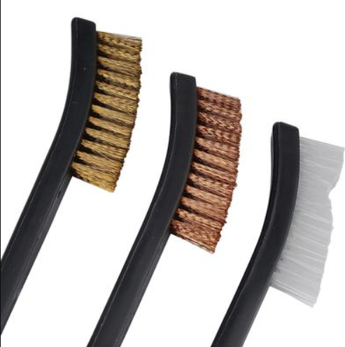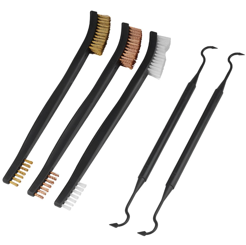 Zestaw składa się z trzech obustronnych szczotek, wykonanych z mosiądzu, nylonu i miedzi. Pozwalają one na bezpieczne czyszczenie różnych powierzchni, bez ryzyka uszkodzenia delikatniejszych części. Dwa polimerowe skrobaki umożliwiają usunięcie twardego nagaru z zakamarków, do których nie dotrą szczotki.